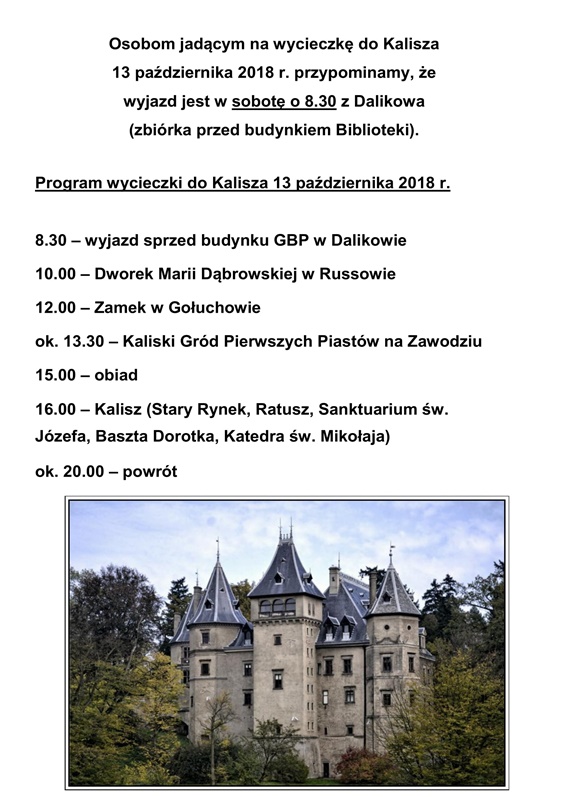 Przeszło 50 osób wybrało się w późny sobotni poranek na wycieczkę po Ziemi Kaliskiej. Na początku zwiedzili Dworek Marii Dąbrowskiej w Russowie, w którym pisarka spędziła szczęśliwe dzieciństwo. Russów stał się pierwowzorem Serbinowa z powieści "Noce i dnie" Dąbrowskiej. Następnie podróżnicy z Dalikowa odwiedzili przepiękny Zamek w Gołuchowie, odrestaurowany przez rodzinę Czartoryskich mieści się w przeszło 160-hektarowym parku. Gołuchów ze względu na swoje walory bywał miejscem akcji filmów m.in. "Akademia pana Kleksa" i "Królowa Bona".